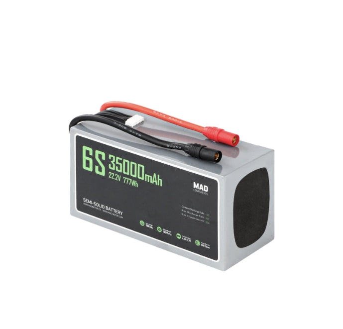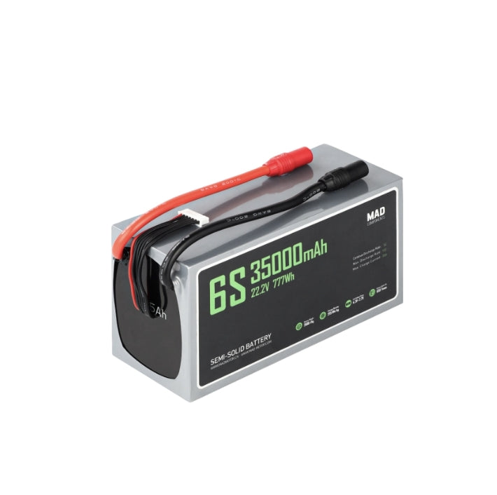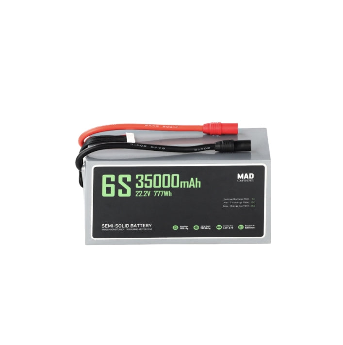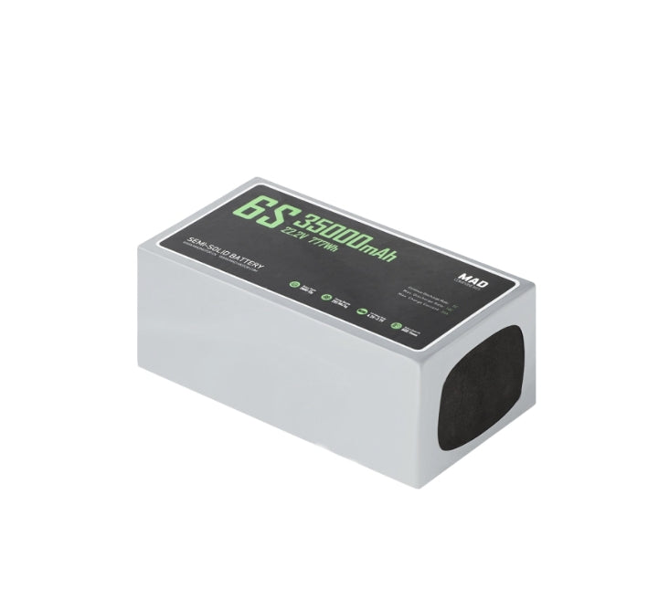 The MAD 6S 35Ah battery delivers high-capacity power for UAVs that require extended flight duration and a robust energy supply. With a 777Wh energy capacity and a continuous discharge of 175A, it is engineered for professional drone applications demanding reliability, efficiency, and safety. Its advanced solid-state lithium-ion technology ensures superior energy density and stable output.