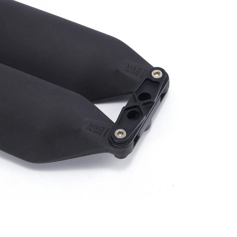 The MAD SPIRO AW 18.4x6.8 folding propeller features a unique anhedral winglet design (AW) that reduces vortex losses, vibrations, and noise while improving efficiency and thrust. Constructed from composite carbon fiber and engineering plastic, this prop measures 467×172.7mm and weighs just 38g. Optimized for 1.5–2.5kg thrust per motor at 3500–4500RPM, it offers lightweight, high-strength performance with superior dynamic balance and compatibility with most multirotor motors.