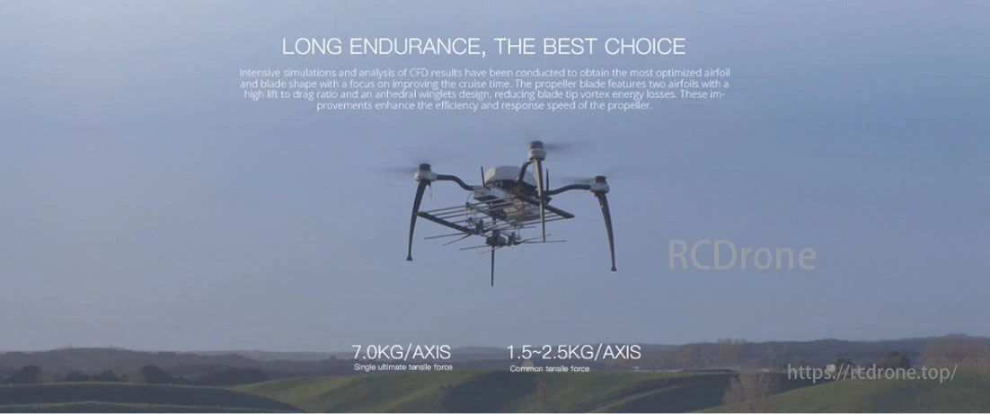 The drone features optimized airfoil and blade design for improved cruise time, high lift-to-drag ratio, and reduced vortex losses, enhancing efficiency and response speed. It supports 7.0KG/AXIS ultimate tensile force and 1.5~2.5KG/AXIS common tensile force.