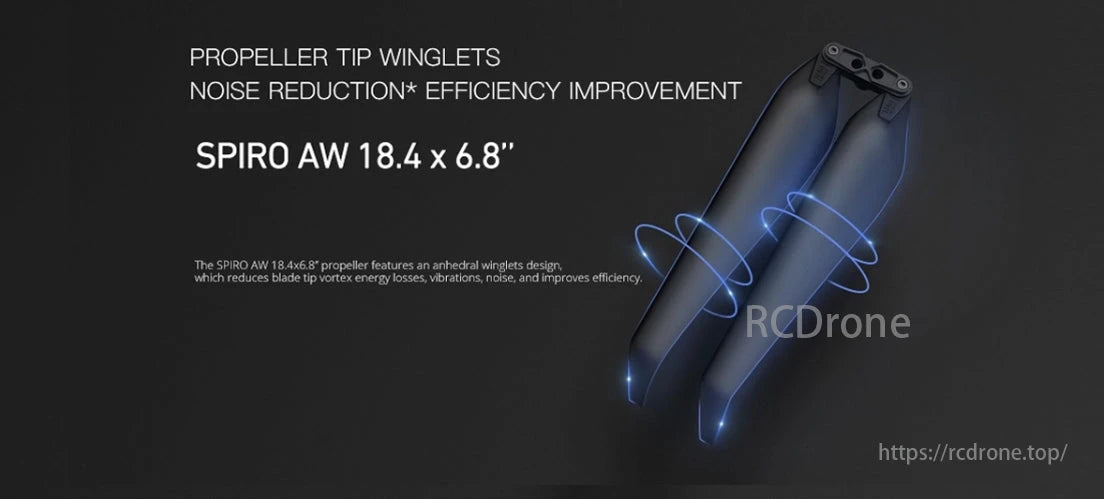 The SPIRO AW 18.4 x 6.8" propeller features anhedral winglets for noise reduction and efficiency improvement, reducing vortex energy losses and vibrations.
