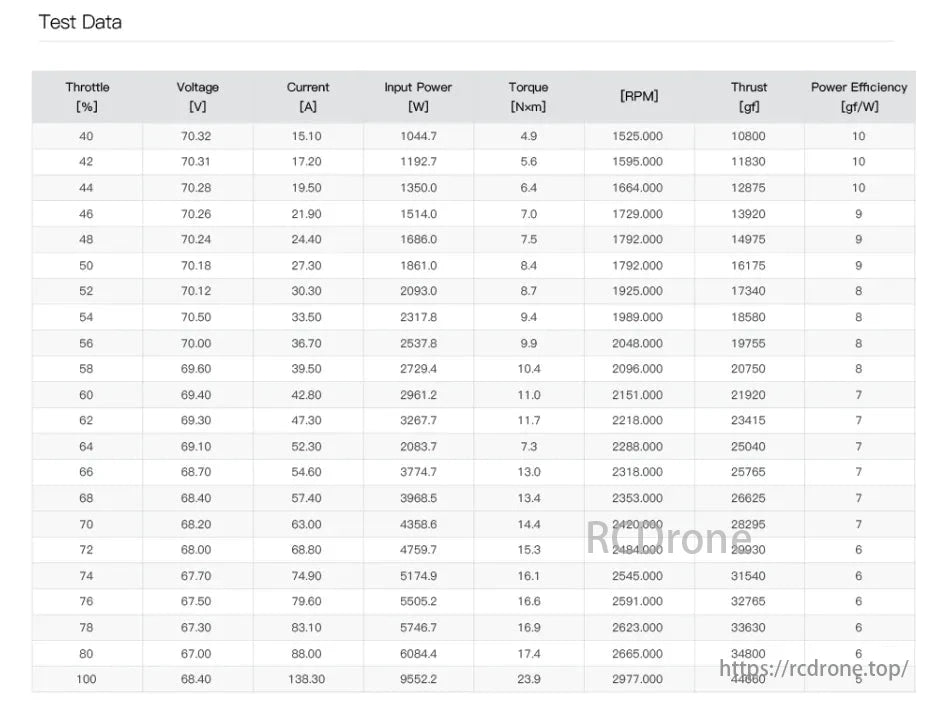 Test Data includes throttle percentage, voltage, current, input power, torque, RPM, thrust, and power efficiency. As throttle increases from 40% to 100%, voltage decreases slightly, while current, input power, torque, RPM, and thrust increase significantly. Power efficiency drops from 10 gf/W to 5 gf/W.