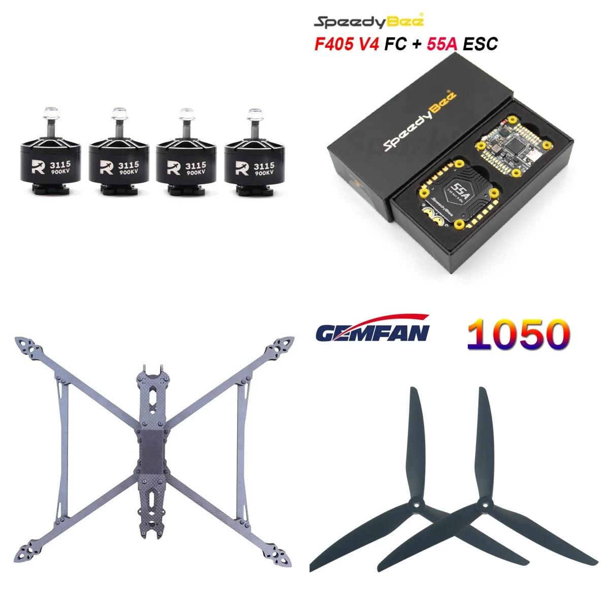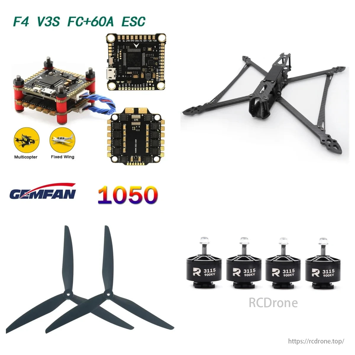 Components for a Mark4 V2 FPV Drone Frame include F4 V3S FC+60A ESC, GEMFAN 1050 propellers, four "R 3115 900KV" motors, and icons for multicopter and fixed-wing use.