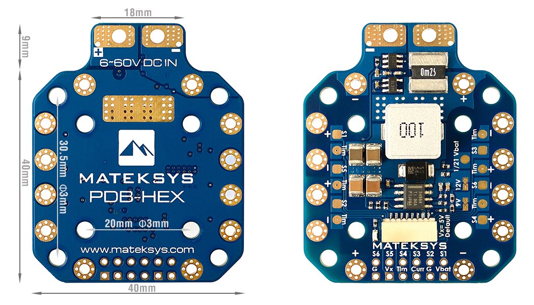 MATEKSYS PDB-HEX 660V DC IN (212S LiPo) BEC 54, 5V/9V/12V ADJ, 5v Default PDB 140A cont. 264A burst . 6 pairs of ESC power pads 126 1K:ZOK voltage divider 40*49*6mm, 12g mounting 30.Smm & 2Omm, @3mm Delauy 3 1/21 Vbat E.