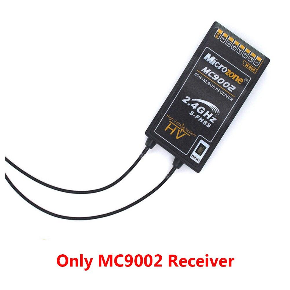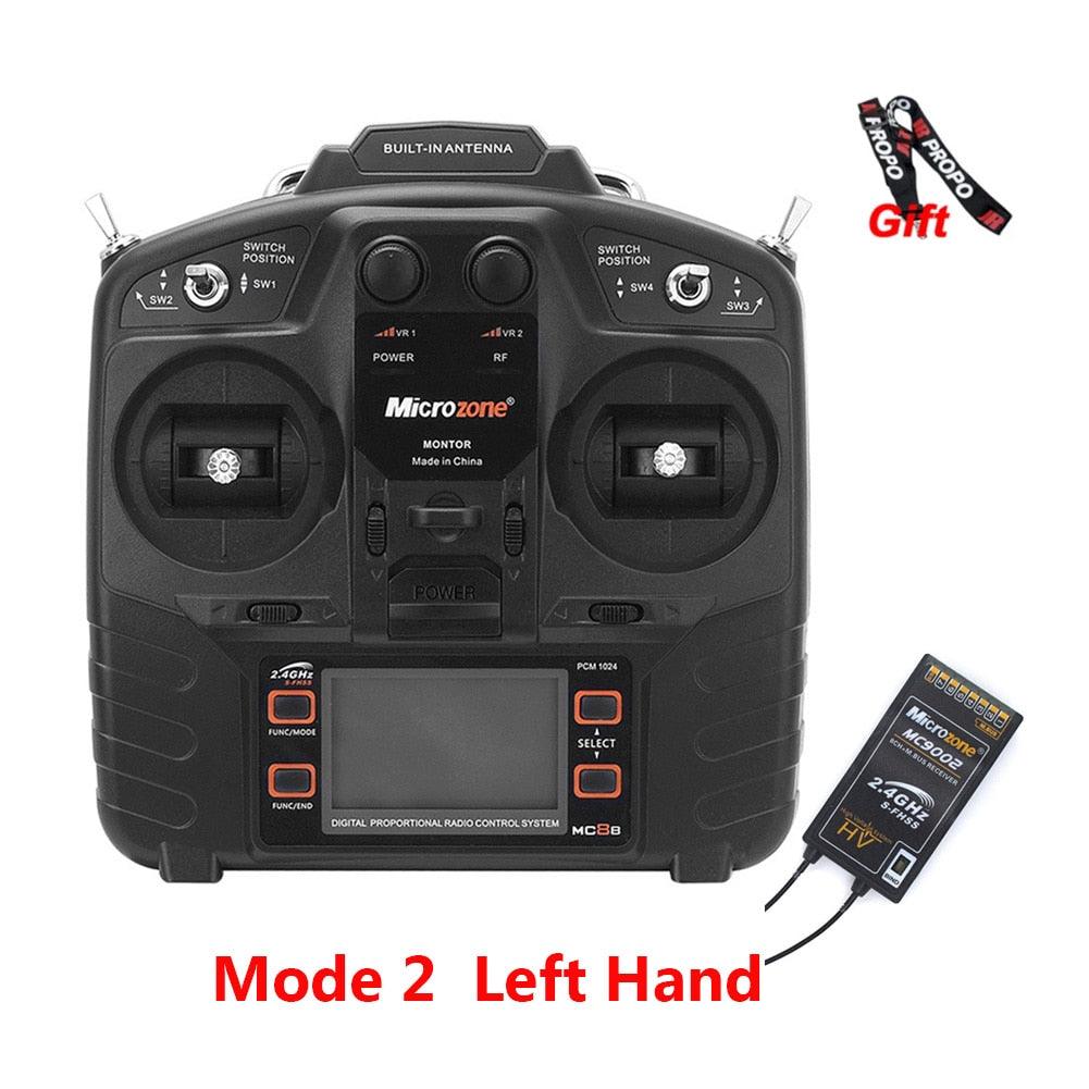 Microzone MC8B 2.4GHz transmitter (MC8RE) with an 8-channel receiver (MC9002), specifically designed for fixed-wing helicopters, drones, and multi-axial UAVs using S.BUS signal, PWM signal, and frequency contact pair for flight control systems like F3/Pix4/Quadcopter.
