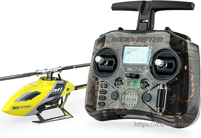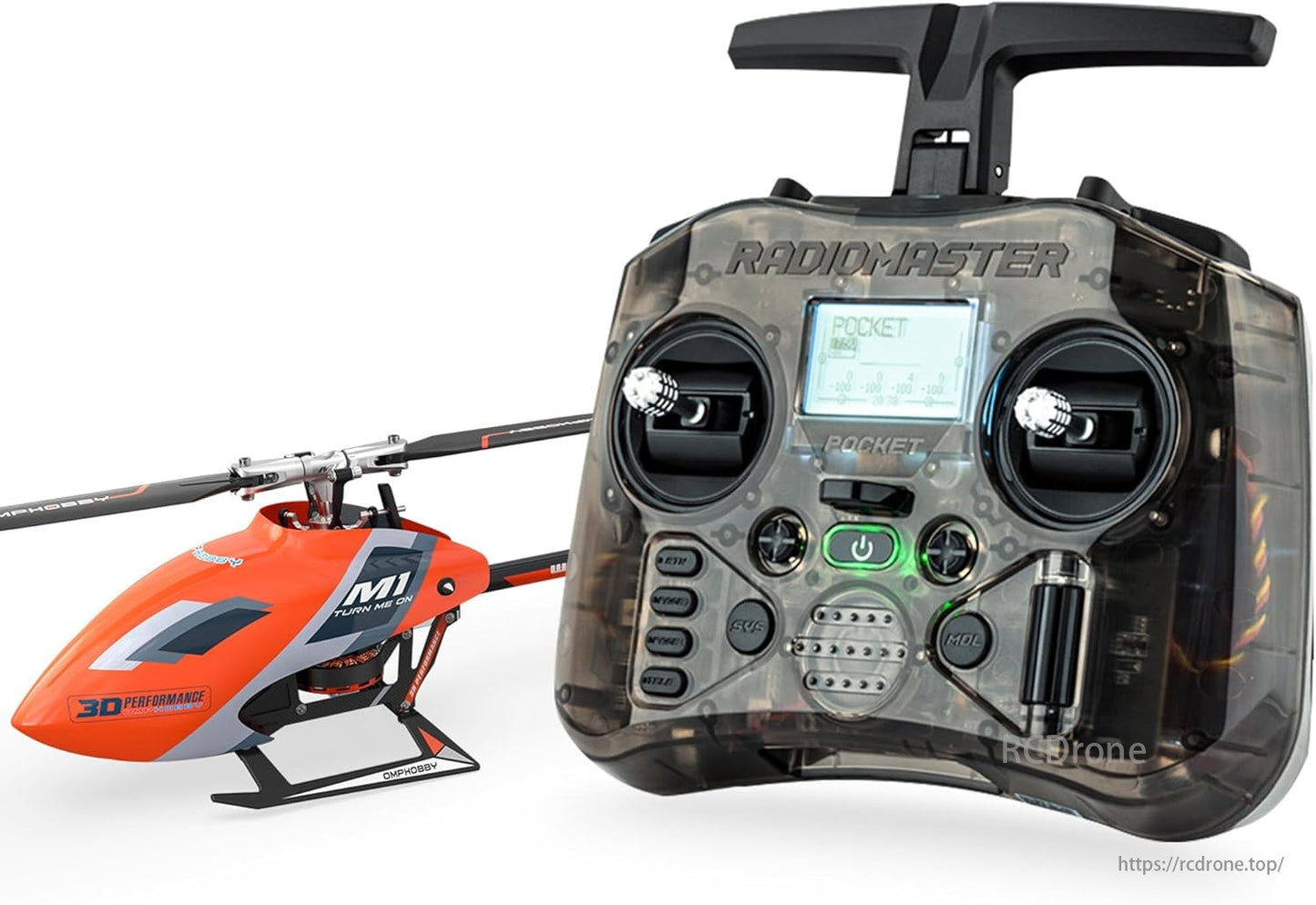 M1 EVO RTF Edition includes a Radiomaster Pocket Radio Controller (M2) with a built-in OMPHOBBY helicopter program for immediate flight. Additional functions are compatible with other RC products.