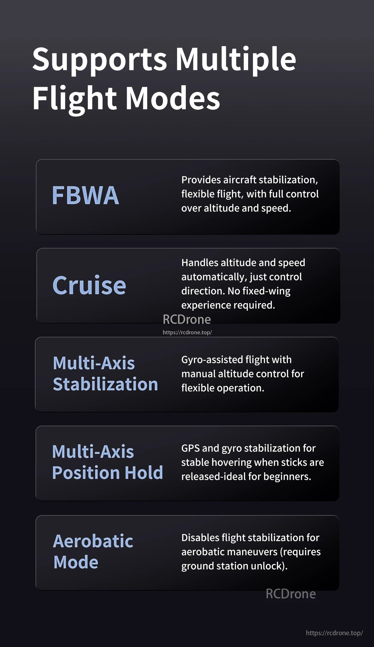 Supports Multiple Flight Modes: FBWA, Cruise, Multi-Axis Stabilization, Multi-Axis Position Hold, Aerobatic Mode. Offers stabilization, flexible flight, automatic altitude/speed control, and aerobatic capabilities.