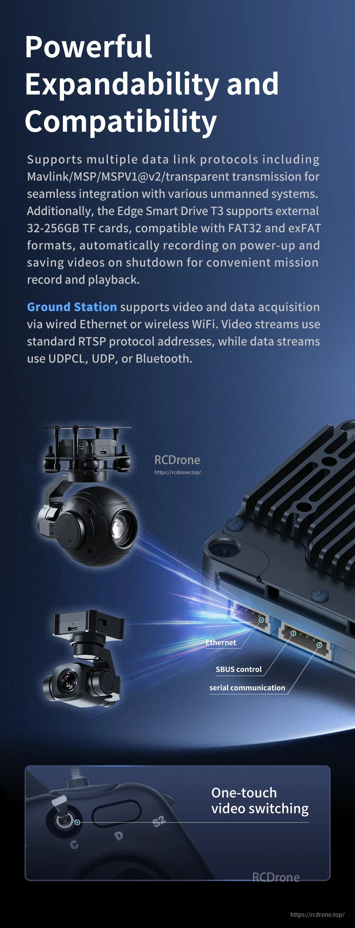 Deep integration with Edge Smart Drive T3 for 1080p/60fps HD video. Zero tearing, ultra-wide dynamic imaging, professional-grade color. 15km+ range, 60ms latency, smart frequency management, anti-interference.