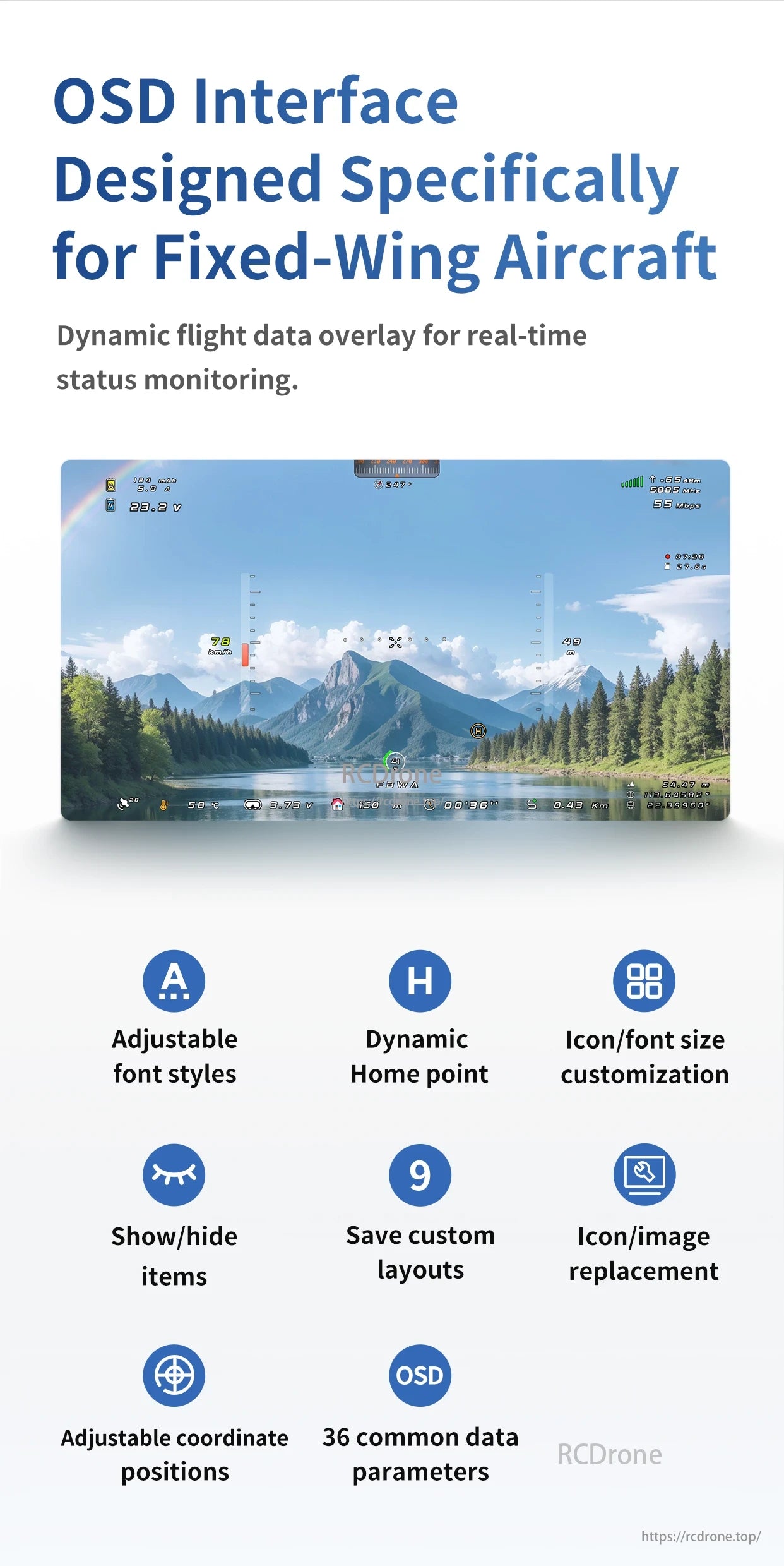 ZMO V2 Tilt-Rotor FPV Drone, The OSD interface for fixed-wing aircraft displays real-time flight data with customizable fonts, icons, layouts, and 36 parameters.