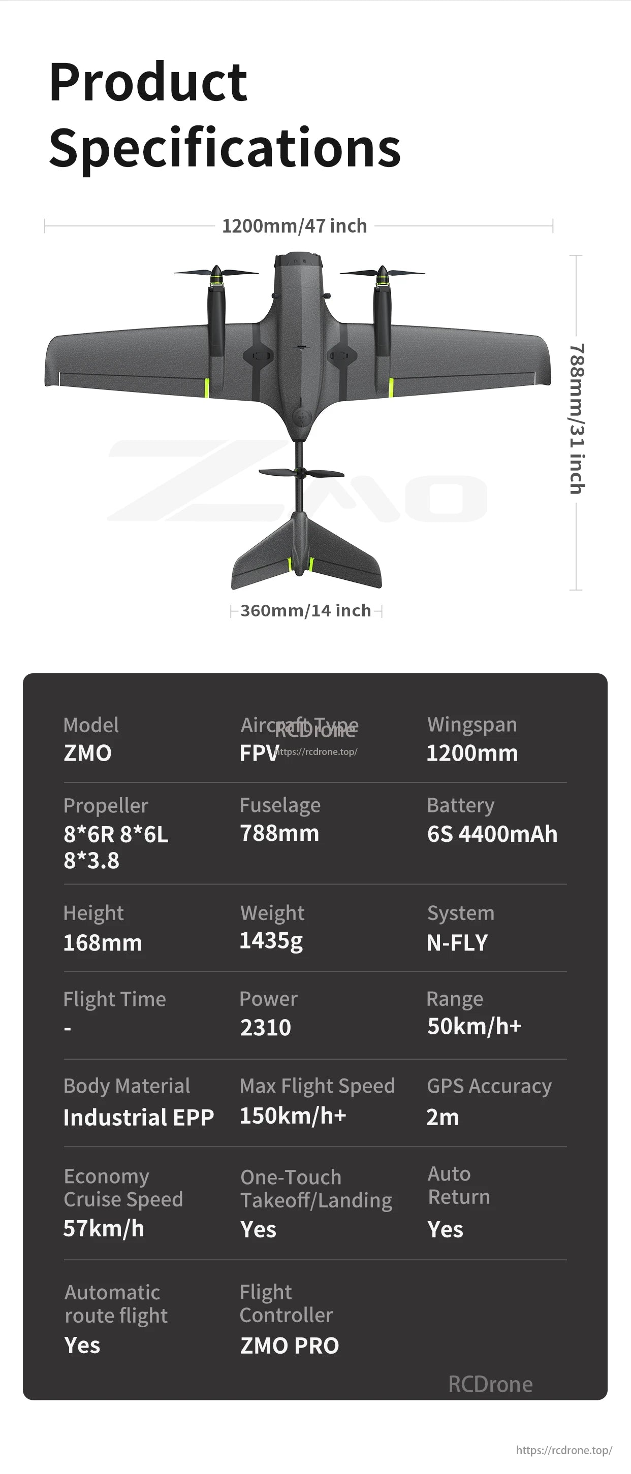 ZMO V2 Tilt-Rotor FPV Drone: 1200mm wingspan, 788mm fuselage, 6S 4400mAh battery, 150km/h max speed, 50km+ range, 2m GPS accuracy, auto return, one-touch takeoff/landing, ZMO PRO flight controller.