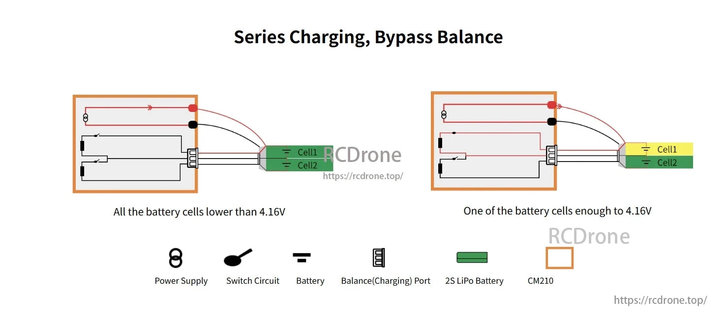 Series Charging, Bypass Balance for 2S LiPo Battery. Charges cells under 4.16V; balances when one reaches 4.16V.