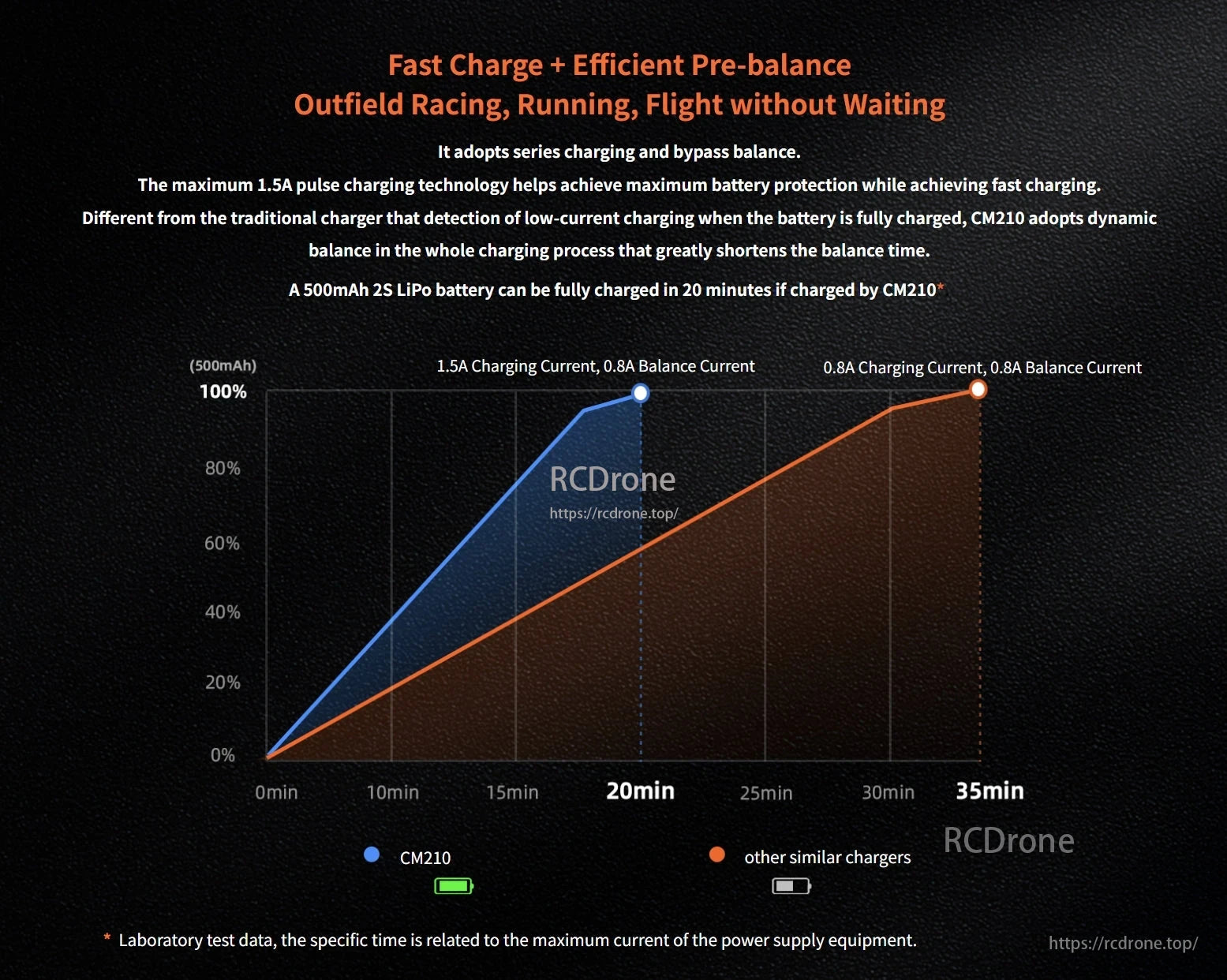 Fast Charge + Efficient Pre-balance for Outfield Racing. CM210 uses 1.5A pulse charging, dynamic balance, and charges a 500mAh 2S LiPo battery in 20 minutes. Other chargers take 35 minutes.