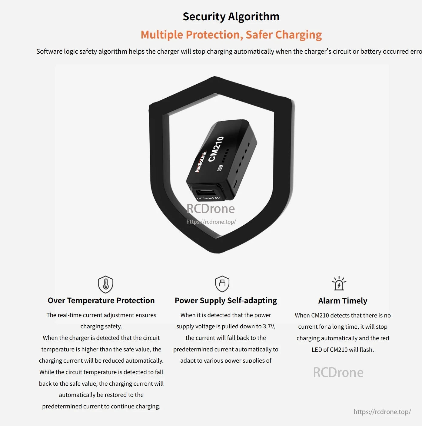 RadioLink CM210 2S LiPo Balance Charger offers multiple protections: over-temperature, power supply self-adapting, and timely alarms for safer charging. Software logic ensures automatic error detection and response.