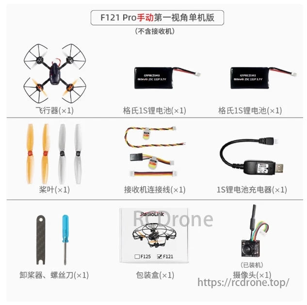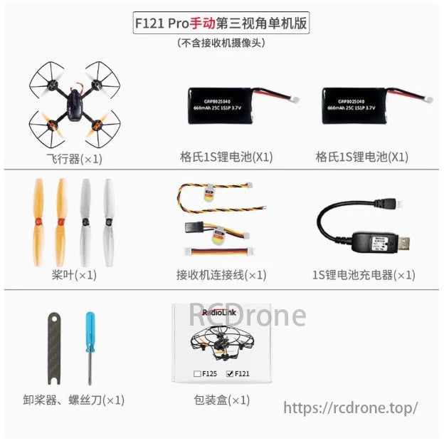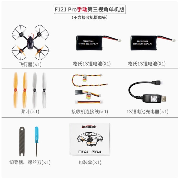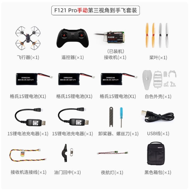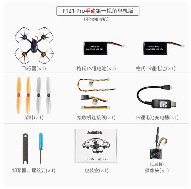 Eneopterinae F12 Pro Advanced Version, includes: Radiolink F121 Pro, transmitter T8S, EMAX43FPV goggles, battery pack, propeller guard, charger, GEMFAN propellers, connecting cables, screwdriver, propeller removal tool, USB cable, LED light for night flight, hook and spring, user manual, carrying bag.