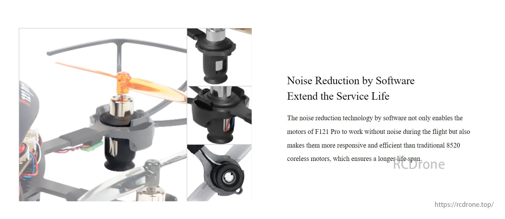 Noise reduction software enhances F121 Pro motors, ensuring quiet, efficient operation and extending service life compared to traditional 8520 coreless motors.