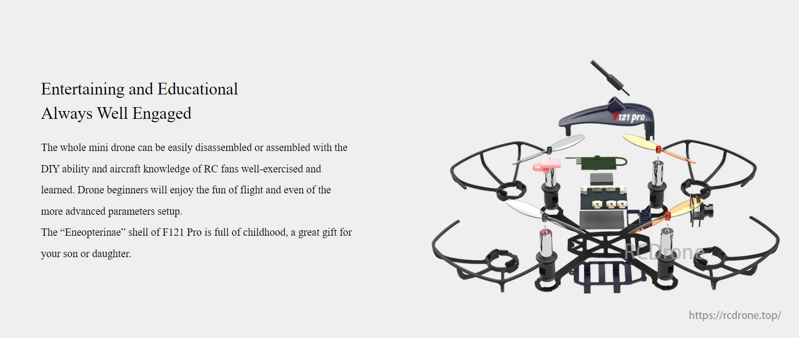 Entertaining and educational, the F121 Pro drone is easily assembled or disassembled. Beginners enjoy flight fun and advanced setup. Its "Eneopterinae" shell makes it a great gift for children.
