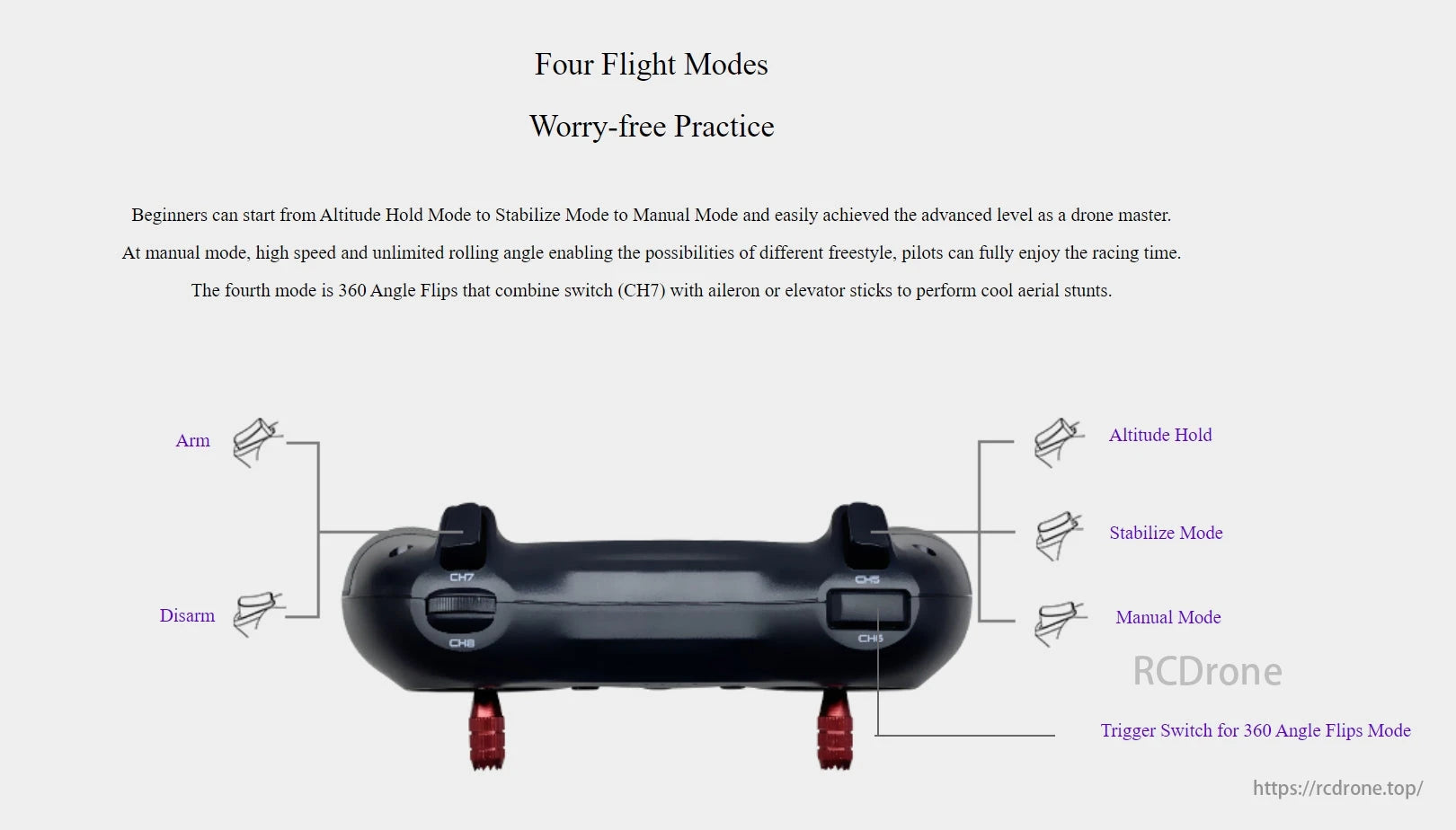 Four flight modes let beginners start with altitude hold mode, then stabilize mode and manual mode. From here, they can easily reach advanced levels as drone masters. In manual mode, high speeds and unlimited rolling angles enable freestyle possibilities, allowing pilots to fully enjoy racing.