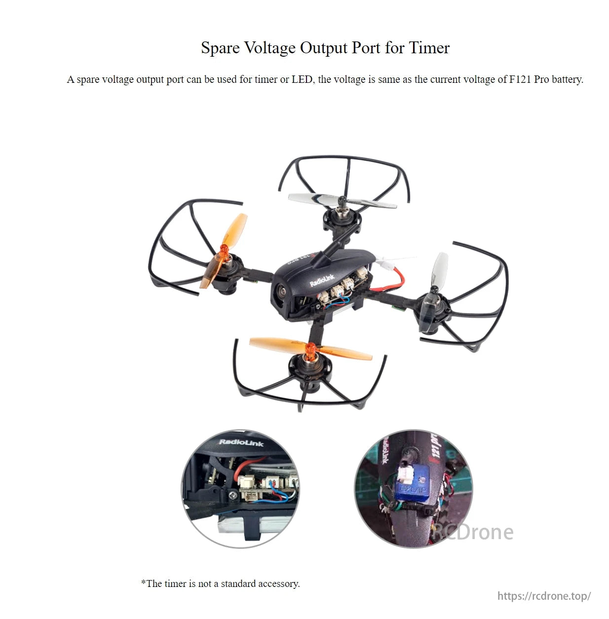 RadioLink F121 Pro drone has a spare voltage output port for timer or LED, matches battery voltage. Timer not included.