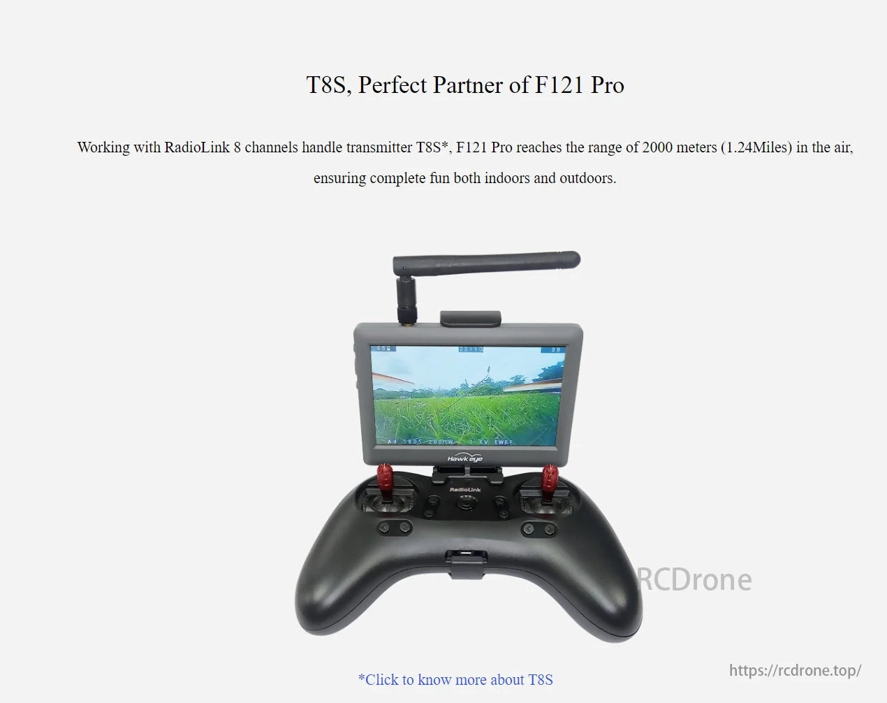 T8S, perfect partner for Fl21 Pro working with RadioLink, an 8-channel transmitter TSS*, reaches a range of 2000 meters (1.24 miles) in the air; ideal for indoor and outdoor use.