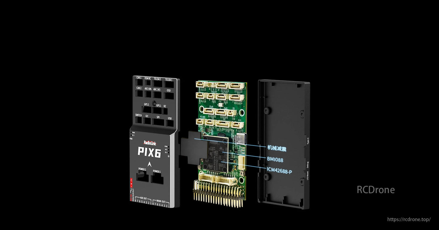 RadioLink PIX6 flight controller combines software and mechanical vibration damping for high-speed accuracy. Dual-gyro (BMI088, ICM42688-P) ensures safety with automatic switching for UAVs.