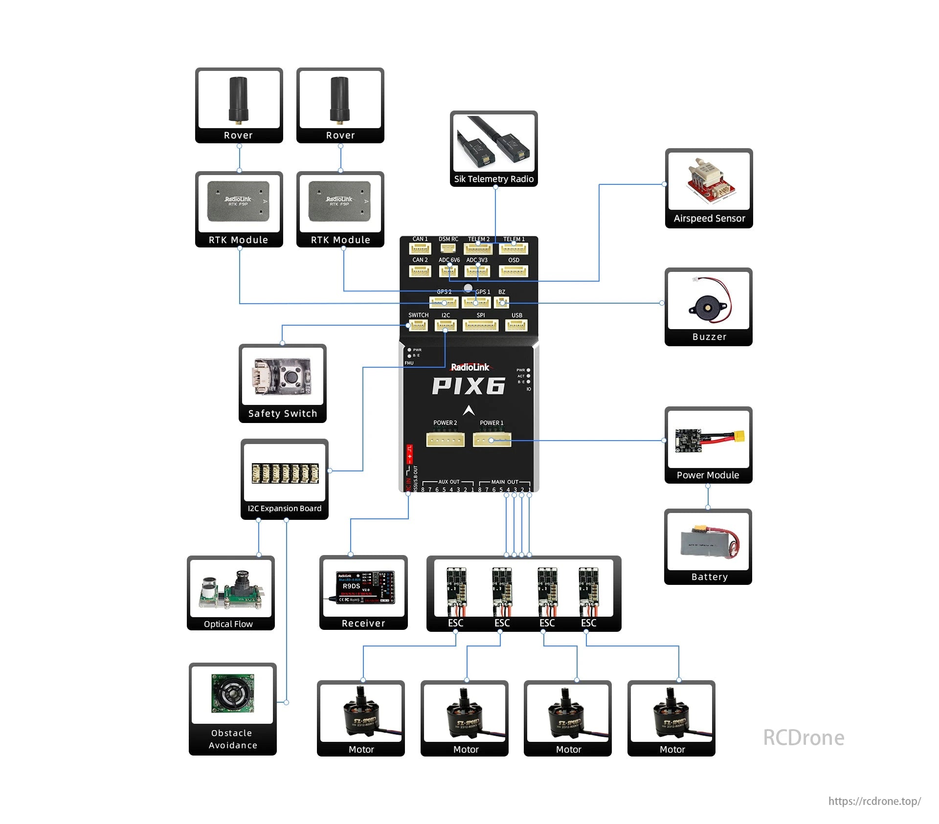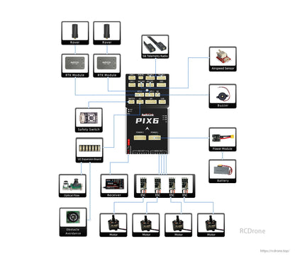 RadioLink PIX6 flight controller supports HD digital and analog video transmission. Connects RTK, telemetry, motors, ESCs, battery, power module, buzzer, airspeed sensor, safety switch, receiver, optical flow, and obstacle avoidance for comprehensive drone control.