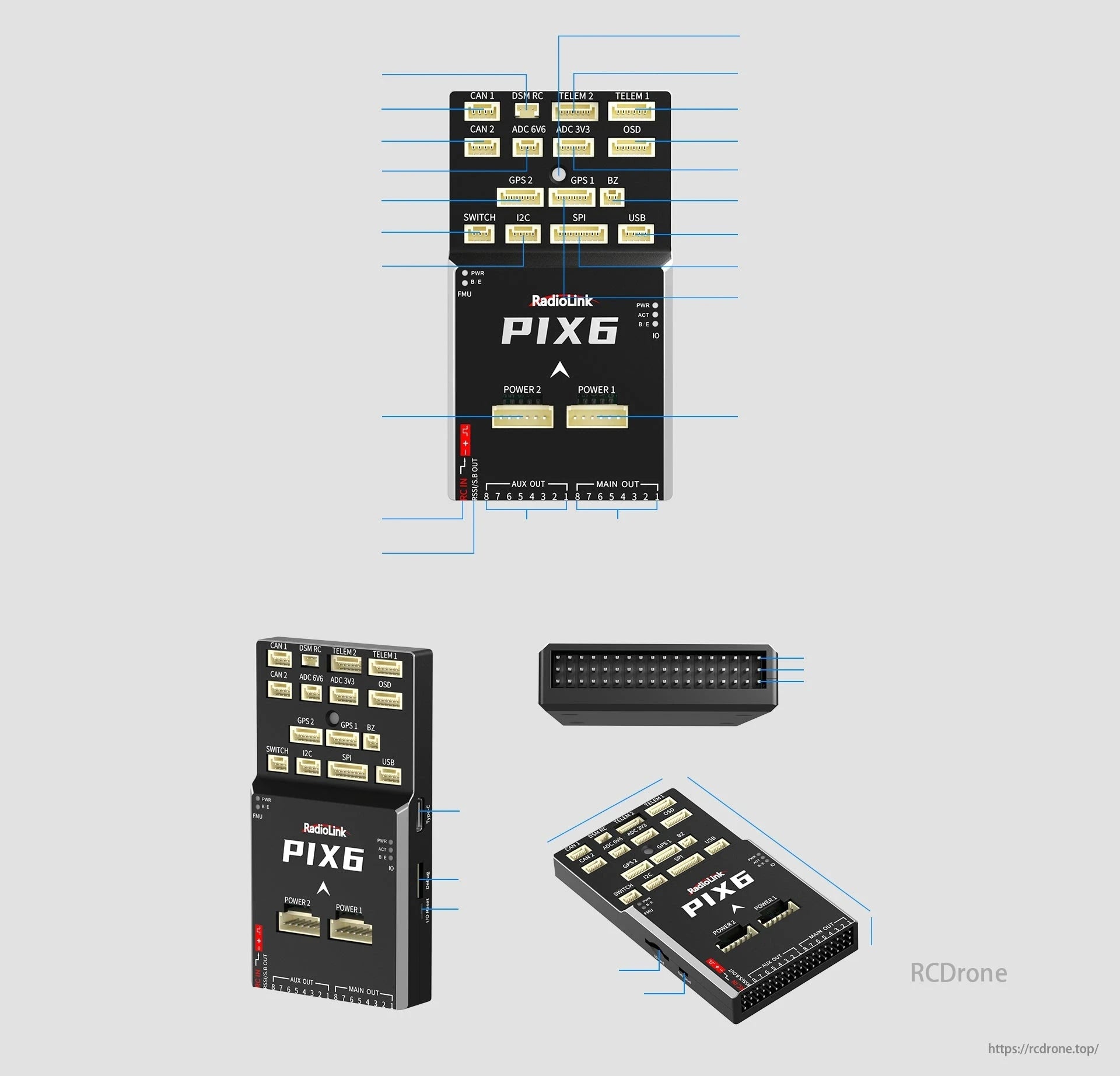 RadioLink PIX6 flight controller with CAN, telemetry, GPS, USB ports. Supports power, I2C, SPI, ADC inputs, and SBUS signals for receiver connection. Features auxiliary and main outputs for advanced settings and motor control.
