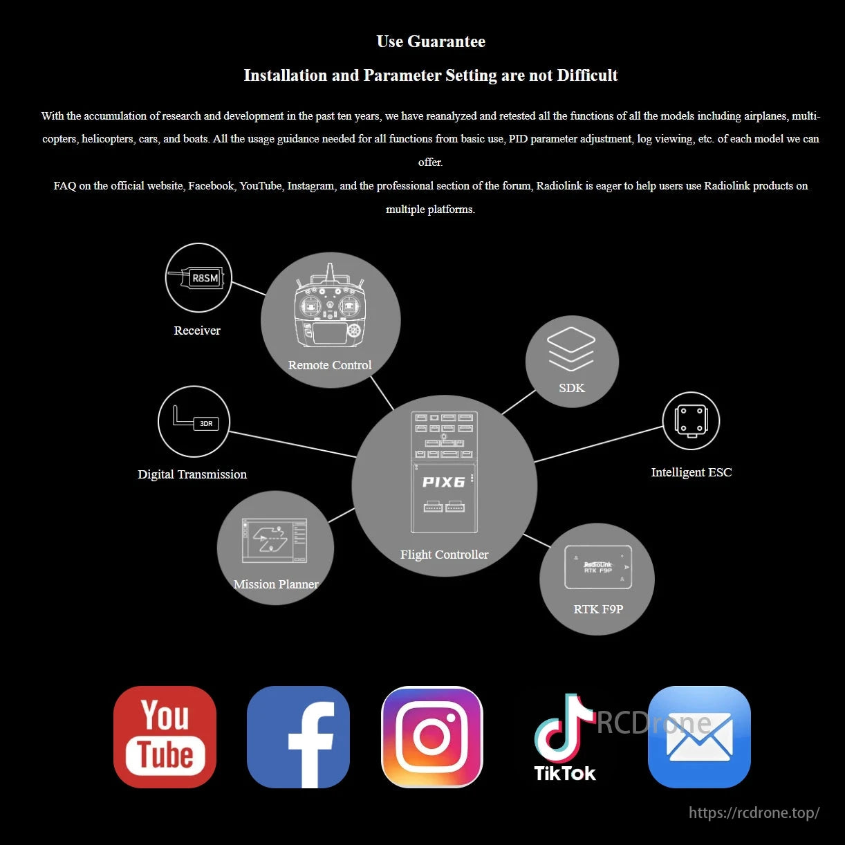 RadioLink PIX6 flight controller ensures easy installation and parameter setting. Supports remote control, receiver, SDK, intelligent ESC, RTK F9P, digital transmission, mission planner. Guidance available on multiple platforms.