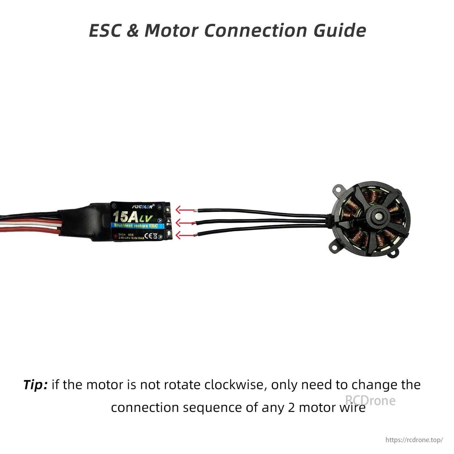 ESC & Motor Connection Guide. 15A LV Brushless motor ESC. Tip: If motor not rotate clockwise, change connection sequence of any 2 motor wires.