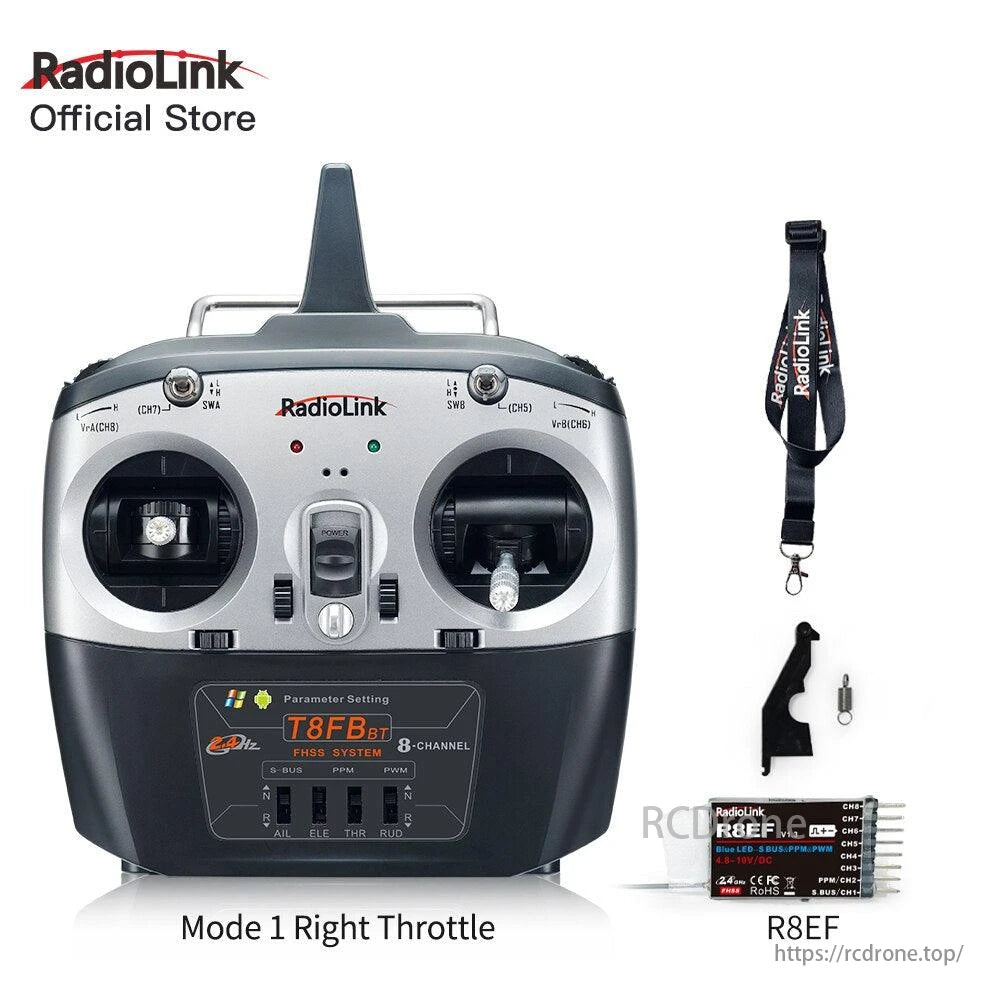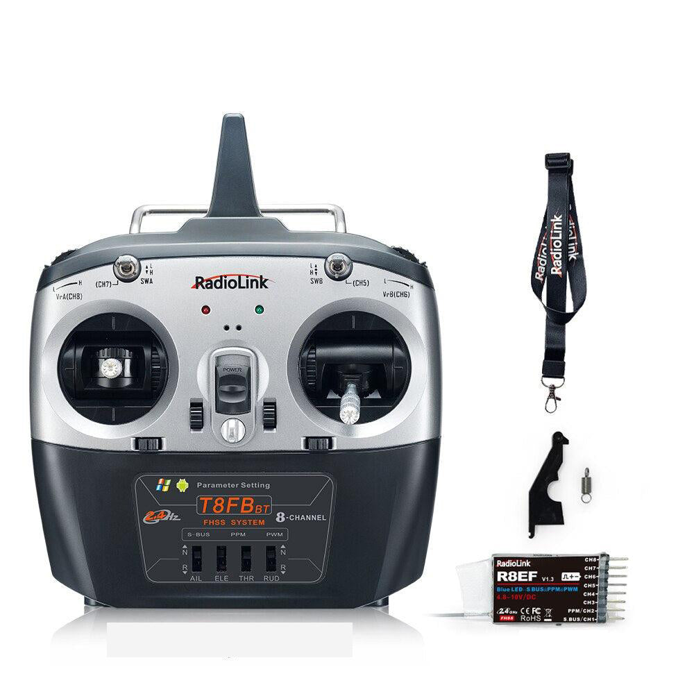 Radiolink T8FB (BT) Package List includes RadioLink R8EF LED, BUSE PPM/AWMM over/over current, Ch3, 2.4GHz. The Radiolink T8FB (BT) package contains an 8-channel radio controller with a receiver and transmitter for FPV drone fixed-wing airplane applications.