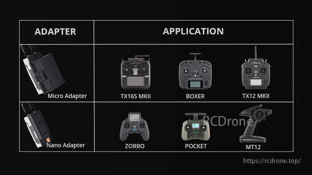 Adapters: Micro, Nano. Applications: TX16S MKII, BOXER, TX12 MKII, ZORRO, POCKET, MT12.