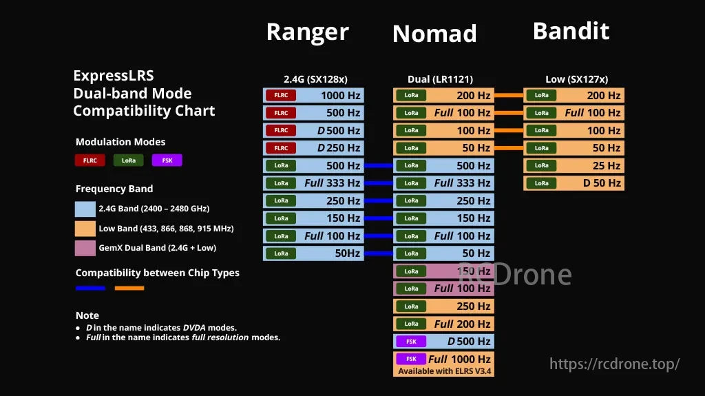 ExpressLRS Dual-band Mode Compatibility Chart for Ranger, Nomad, and Bandit. Details modulation modes (FLRC, LoRa, FSK), frequency bands (2.4G, Low, GemX), and compatibility between chip types with various Hz rates.