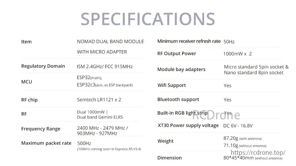 Nomad Gemini ExpressLRS Module: Dual-band, 2.4GHz/915MHz, ESP32 MCU, Semtech RF chip, 1000mW power, 500Hz packet rate, RGB light, XT30 power, 80x45x40mm size, 71.10g weight (without antenna).