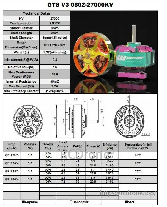 GTS V3 0802-27000KV motor specs: 9N12P, 8mm stator, 27000KV, 1.97g weight. Max power 26.6W at 3S, max current 7.2A. Efficiency over 82% at 1-2A. Tested with various props at 3.7V.