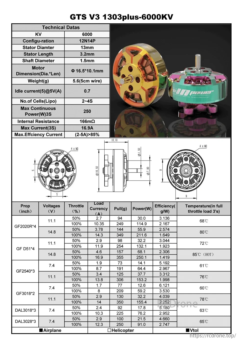 GTS V3 1303plus-6000KV motor specs: 12N14P config, 13mm stator, 6000KV, 5.6g weight. Max 250W power, 16.9A current. Efficiency over 85% at 2-5A. Tested with various props at different voltages and loads.
