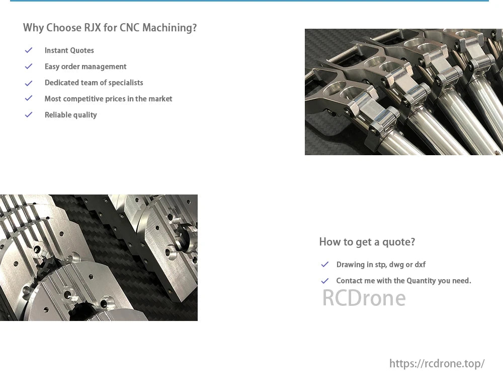 RJX offers CNC machining services with instant quotes, easy order management, a dedicated team of specialists, competitive pricing, and reliable quality. To get a quote, provide drawings in stp, dwg, or dxf format and specify the required quantity.