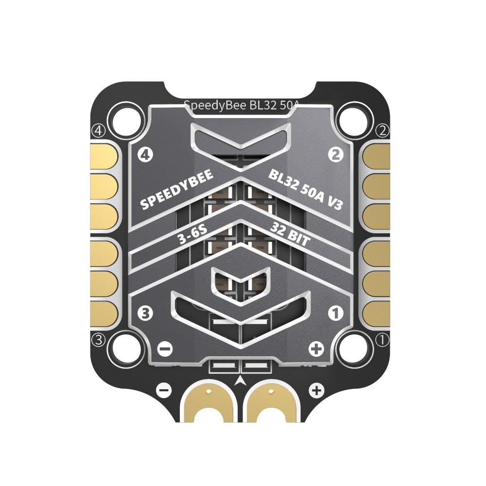 SpeedyBee BL32 50A 4-in-1 ESC 50A ESC MADE FOR CHAMPIONS +12 34CT 4206 067i 4206 9cci BL37 V3 32 9u21 Equipped with a CNC heat sink Real 50A output; real performance for cooler ESC Support up to 128KHz PWM TVS protective diode + 1500uF Low frequency ESR capacitor for more protection