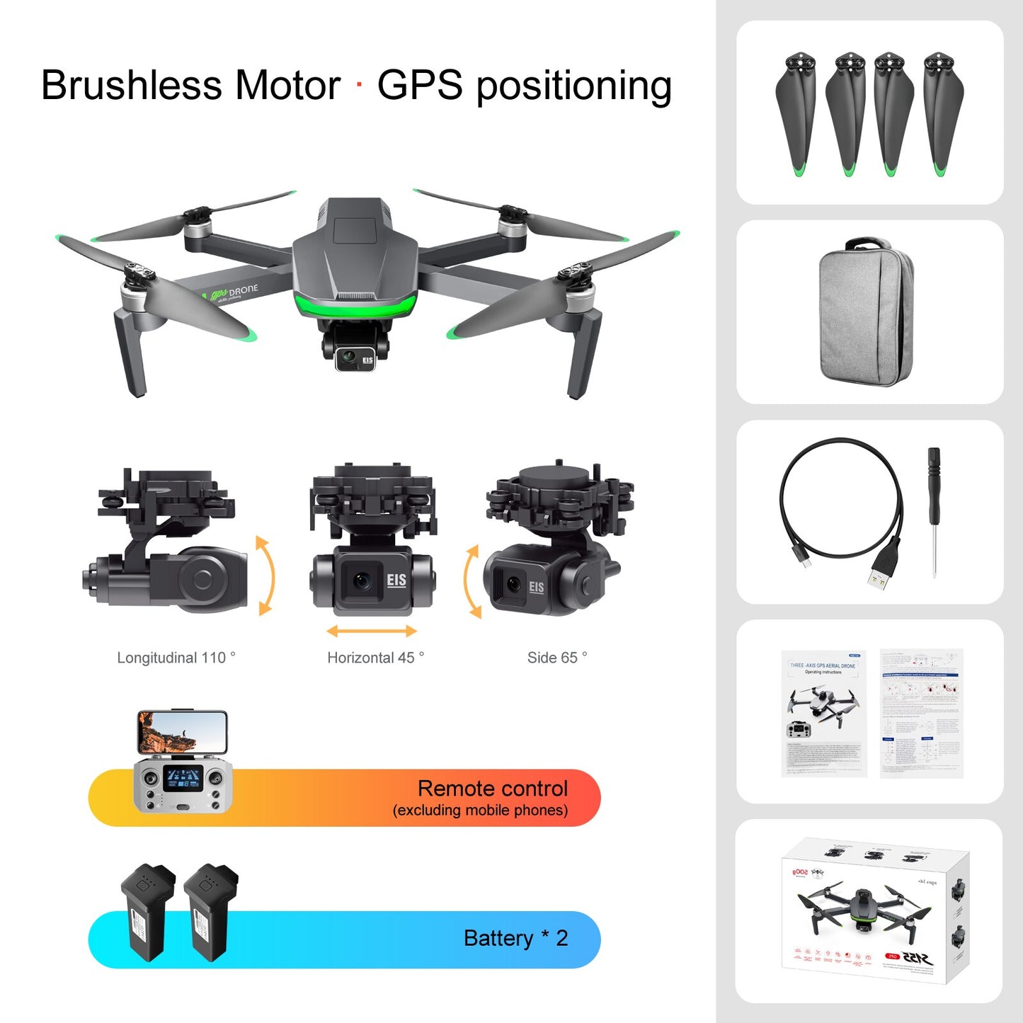 This product package includes three-axis GPS aerial drone, components and manual, suitable for ages 14+, with a weight of approximately 500g.
