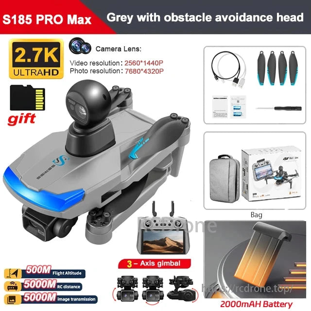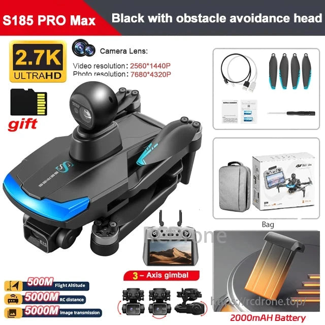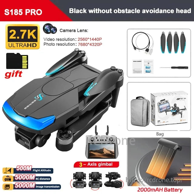 S185 features dual GPS, brushless motor, return flight, gimbal, 2.7K HD lens, intelligent follow, large battery, obstacle avoidance, surrounding flight, remote control, one-click return, and speed switching.