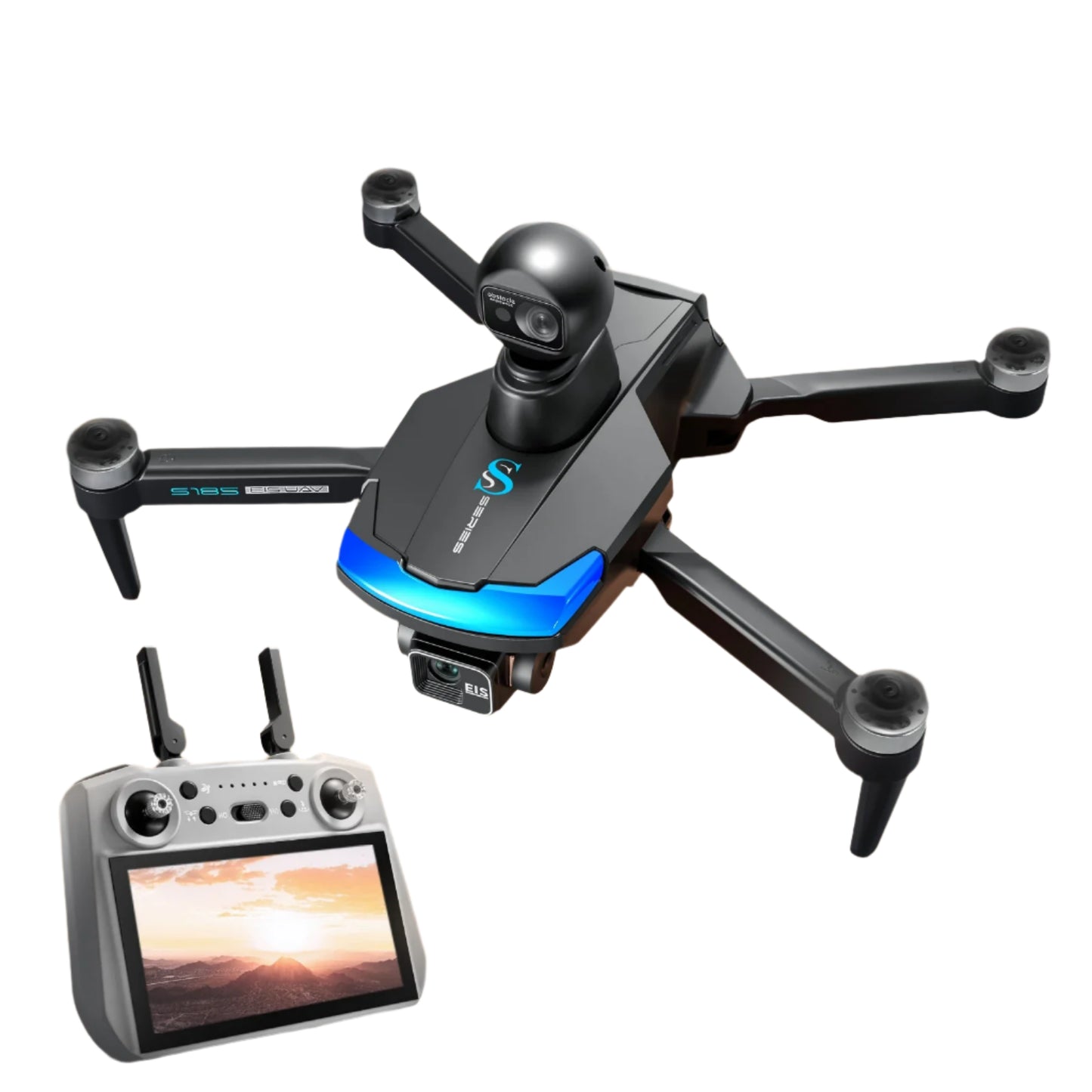 248g fuselage, 3-axis gimbal stabilization. S185 drone with blue accents.