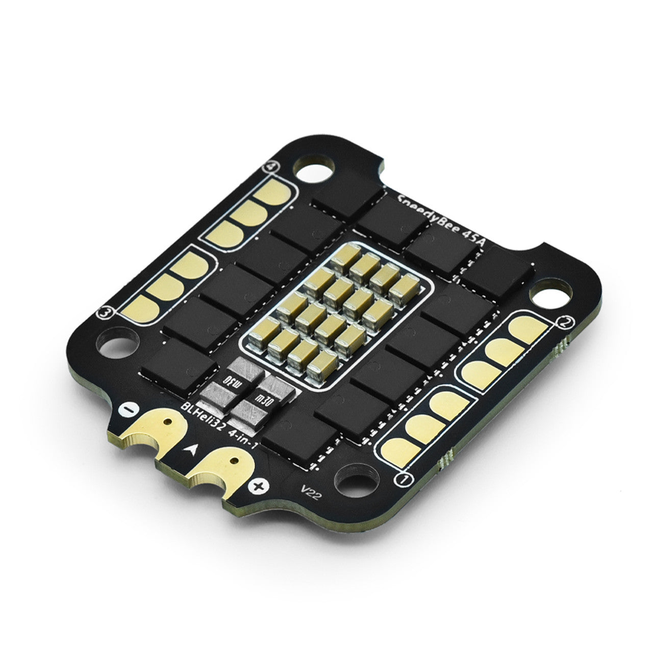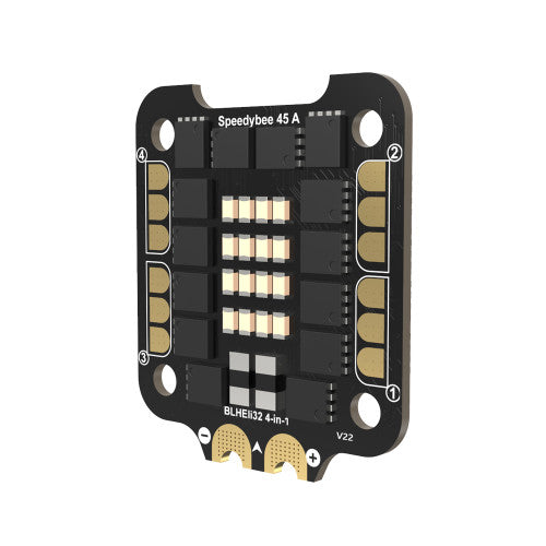 SpeedyBee BLHeli32 45A 128KHz 4-in-1 ESC (V22): MOSFET: NTO43NL, Filtering Caps: 47uF x 16, Ammeter Input Voltage: 3~65V LiPo, Connector: 8P JST to FC, MCU Filtering Caps: 47uF x 5, Continuous Current: 45A, Burst Current: 55A (10s), Firmware Name: SpeedyBee 4in1 ESC Protocol: DSHOT300/600/1200