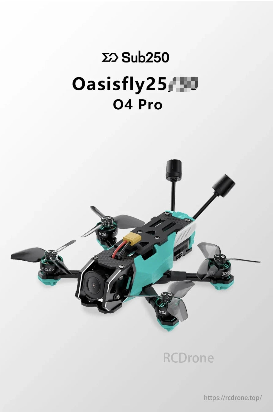 Oasisfly25 O4 Pro: Sub250 1404/4500kv, 170±3g, 135mm wheelbase. PNP/ELRS2.4G/TBSnanoRx, Redfox A3 45A FC, STM32F722RET6 MCU, DJI O4 pro VTX/Camera, BLHeli_32 45A ESC, XT30 connector, HQProp 2.5x2.5x3, ICM42688-P gyro, 4S 660mAh battery, 3mm arms.