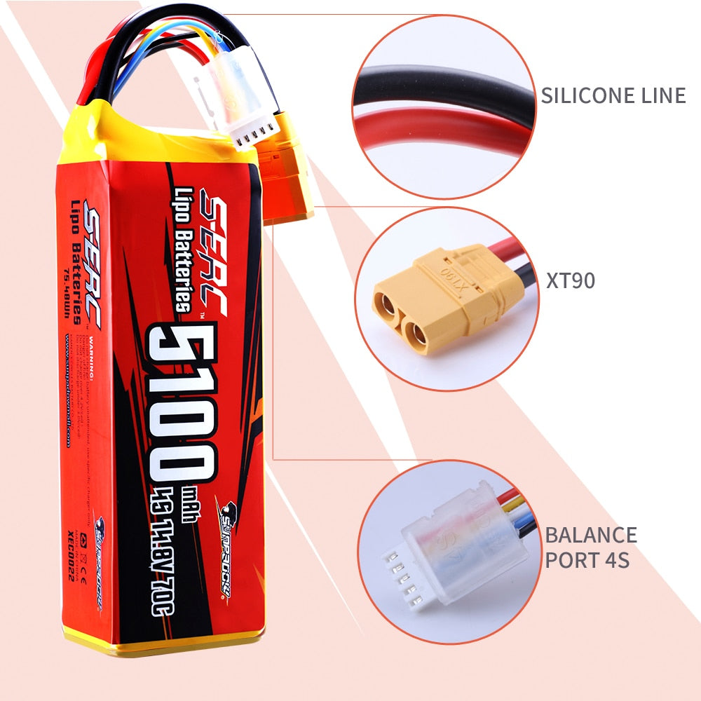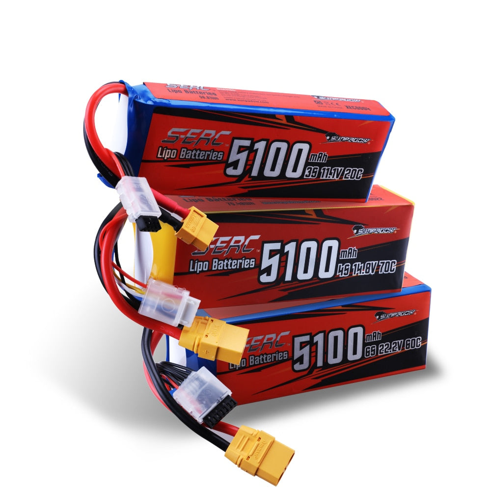 Sunpadow RC 3S, 4S, or 6S Lipo Battery: 5100mAh capacity for use with 11.1V, 14.8V, or 22.2V devices featuring an XT60 or XT90 plug, suitable for applications such as racing airplanes, drones, and FPV helicopters. And here is a rewritten version of the second sentence: