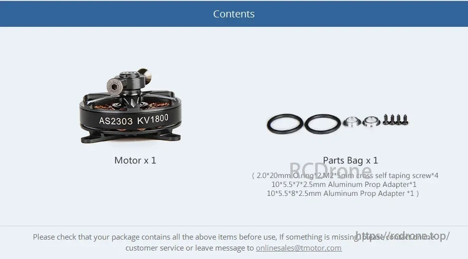 Contents include: Motor x 1 (AS2303 KV1800) and Parts Bag x 1. The parts bag contains 2.0*20mm O rings (2), M2*5mm cross self-taping screws (4), a 10*5.5*7*2.5mm aluminum prop adapter (1), and a 10*5.5*8*2.5mm aluminum prop adapter (1). Ensure all items are present before use. For missing items, contact online customer service or email onlinesales@tmotor.com.