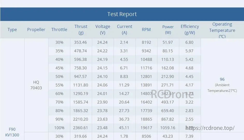 Test report for T-MOTOR F90 KV1300 with HQ 70403 propeller. Data includes throttle, thrust, voltage, current, RPM, power, efficiency, and operating temperature at various settings. Ambient temperature: 27°C.