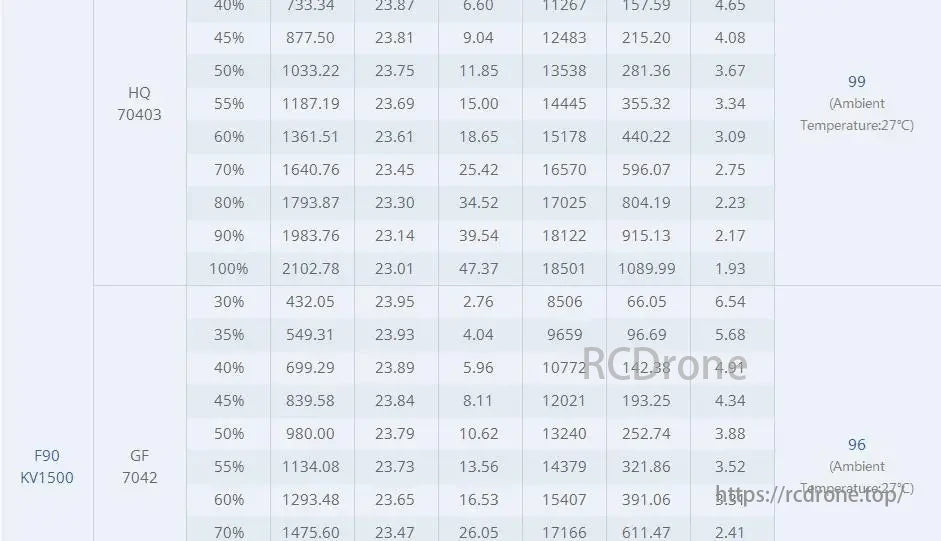 T-MOTOR HQ 70403 and F90 KV1500 GF 7042 performance data at various percentages, including voltage, current, power, RPM, torque, and efficiency, with ambient temperature at 27°C.