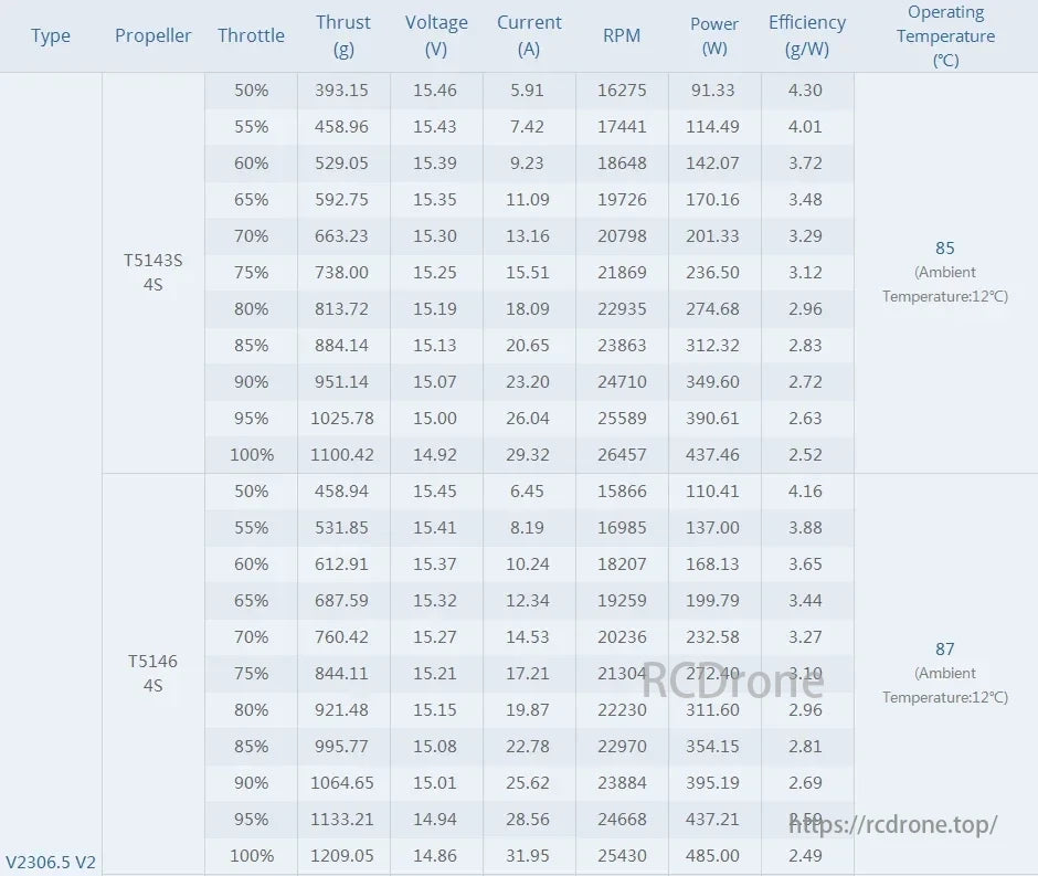 T-Motor performance data for T5143S 4S and T5146 4S propellers. Includes throttle, thrust, voltage, current, RPM, power, efficiency, and operating temperature at various settings. Ambient temperature: 12°C.