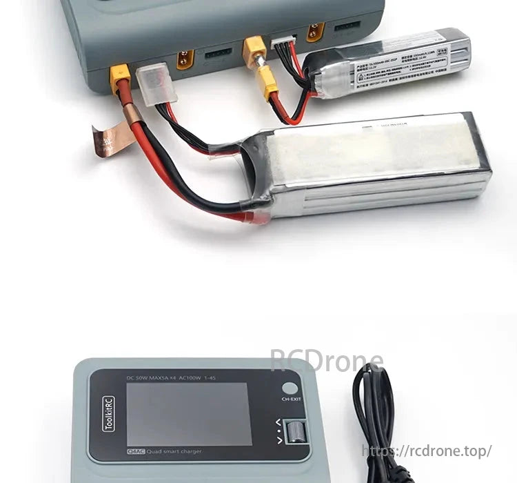 ToolkitRC Q4AC 1-4S Charger with XT60/XT30 outputs, multi-language support, suits global users.