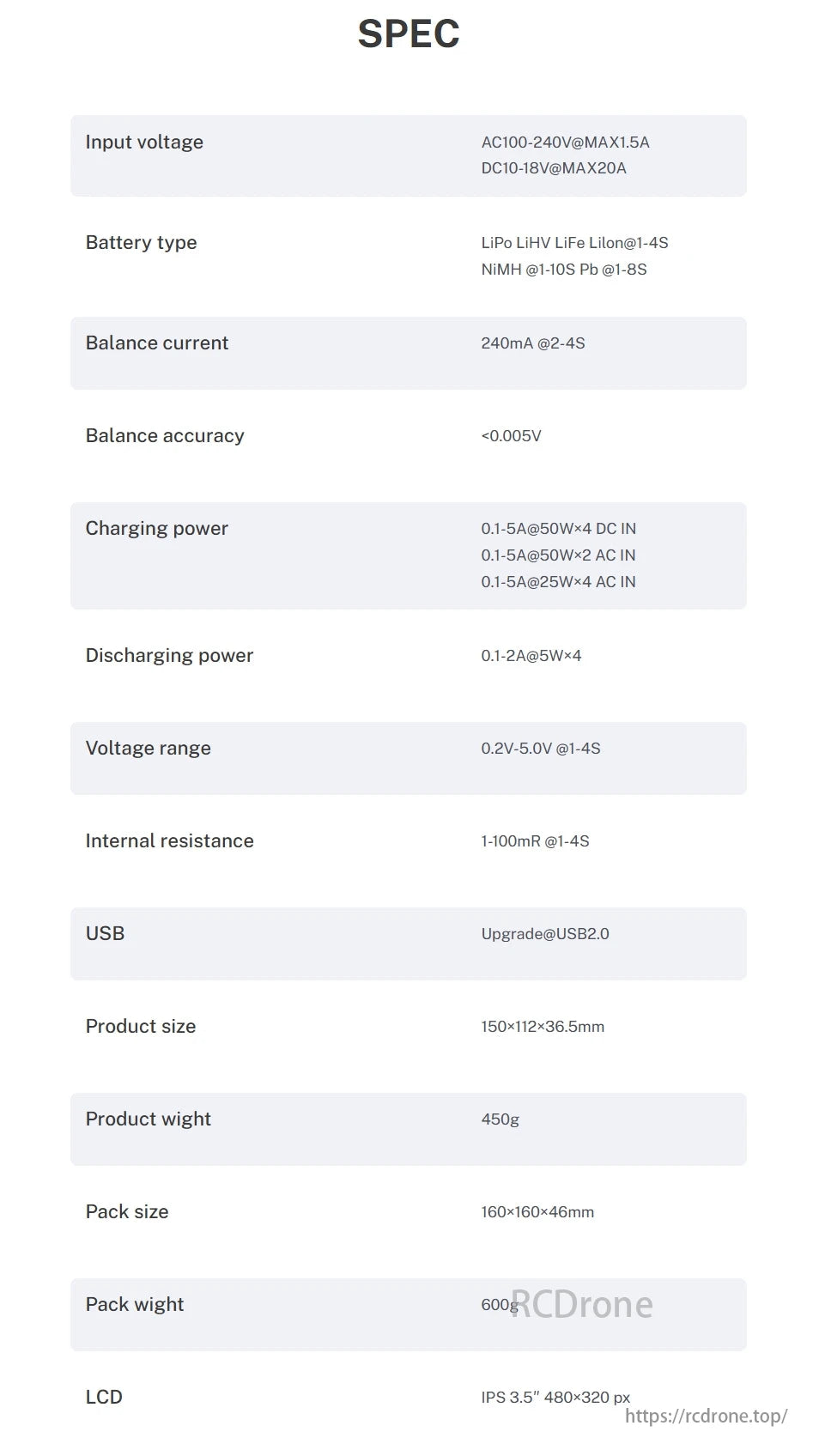 | Battery Types | LiPo / LiHV / LiFe / Li-ion (1–4S), NiMH (1–10S), Pb (1–8S) |