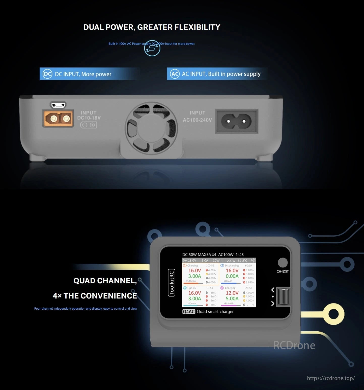 The ToolkitRC Q4AC is a powerful and intelligent 4-channel AC/DC charger built for RC enthusiasts who demand flexibility and precision. Featuring dual power modes (100W AC / 200W DC), four independently controlled outputs, and XT60 output ports (XT30 adapter included), it supports a wide range of battery types from 1S to 4S LiPo, LiHV, LiFe, and more.