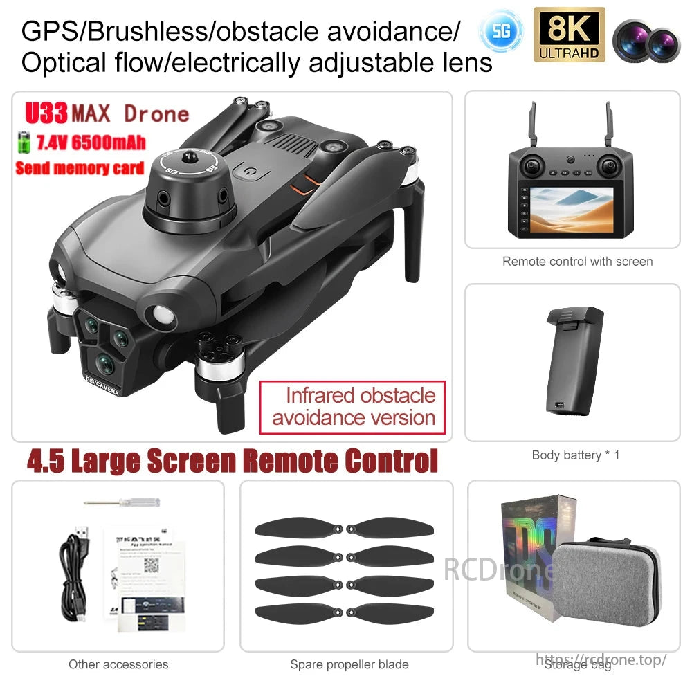 U33 MAX features 8K GPS, brushless motor, obstacle avoidance. Upgrade remote control includes a screen for enhanced functionality and control.