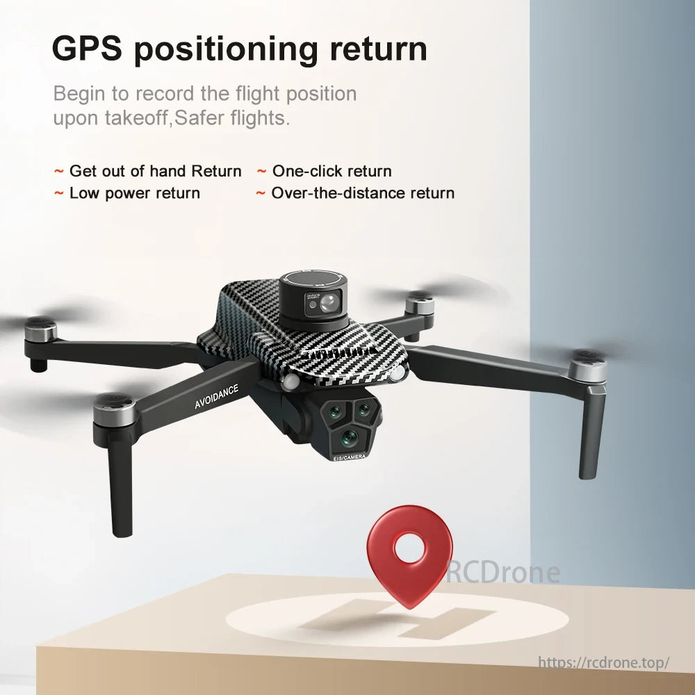 GPS positioning return begins recording flight position on takeoff for safer flights. Features include out-of-hand, low power, one-click, and over-distance returns.